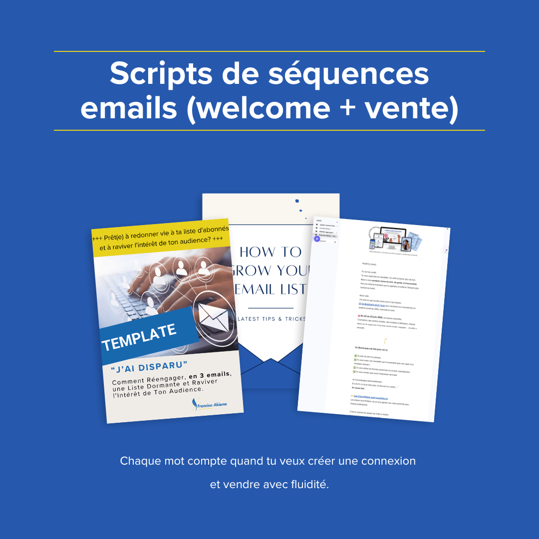Chaque mot compte quand tu veux créer une connexion et vendre avec fluidité. Ces scripts t’aident à poser les bonnes bases dès le premier email, puis à accompagner ton abonné jusqu’à l’achat avec des messages stratégiques, humains et impactants.